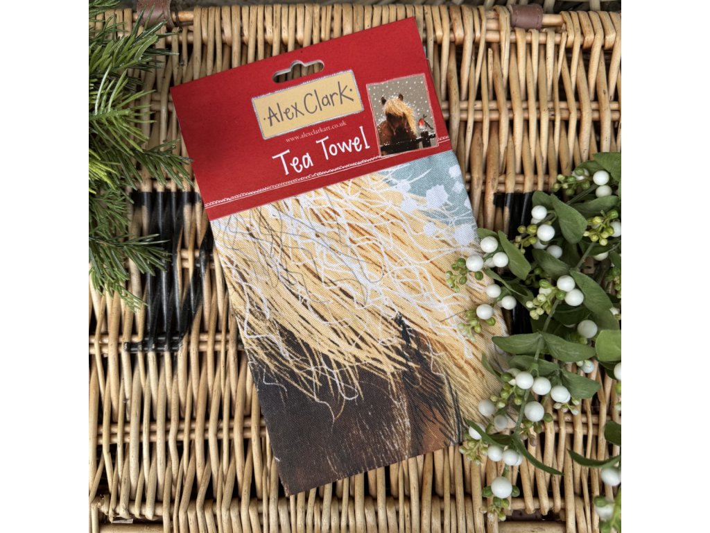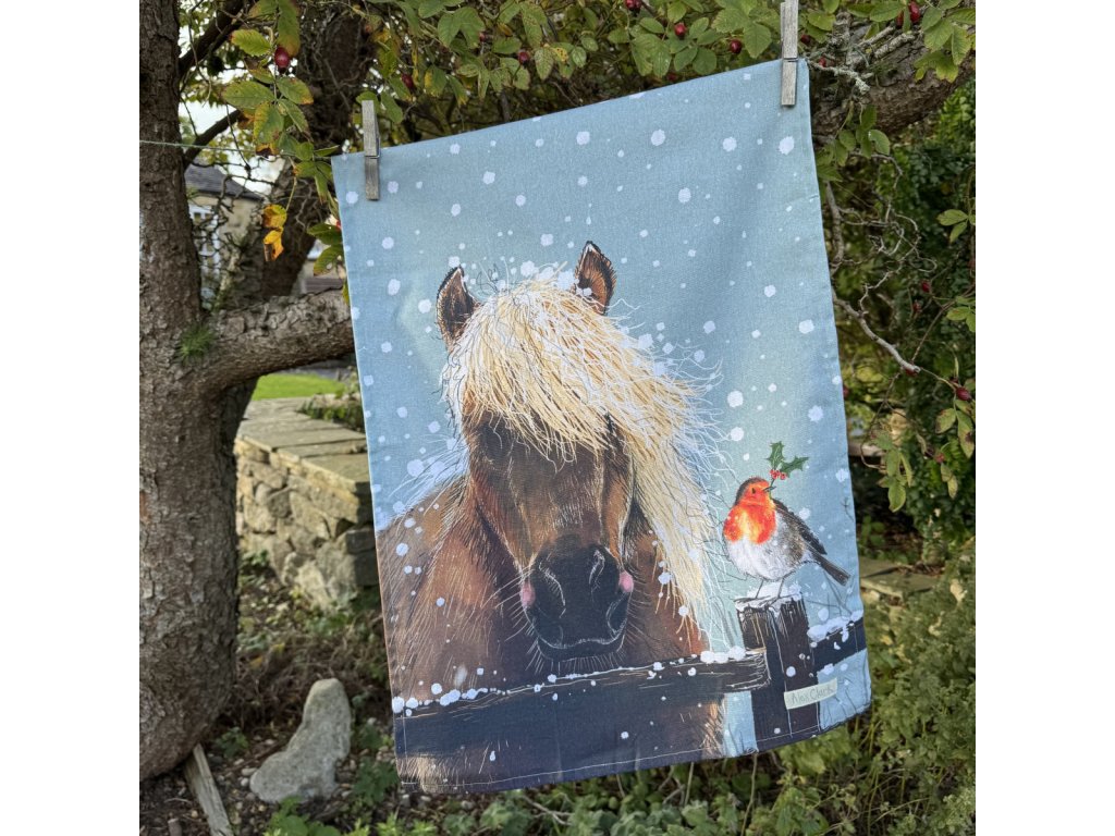 Bavlněná utěrka s motivem koníka a ptáčka se zimním nádechem od anglické malířky Alex Clark.