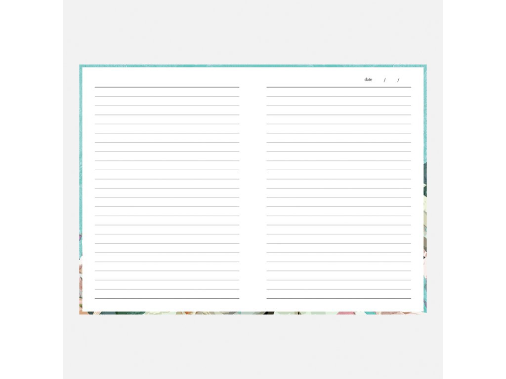 Větší linkovaný zápisník, s gumičkou, která brání otevření notesu, s motivem s ptáčky.